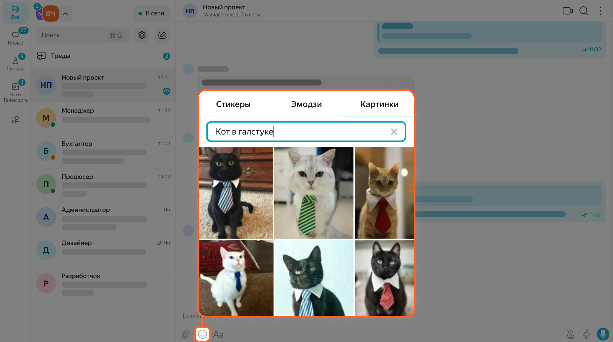 Любое изображение, которое есть в Яндекс Картинках, можно найти и отправить прямо в Мессенджере. Для этого в поле для ввода сообщения нажмите
