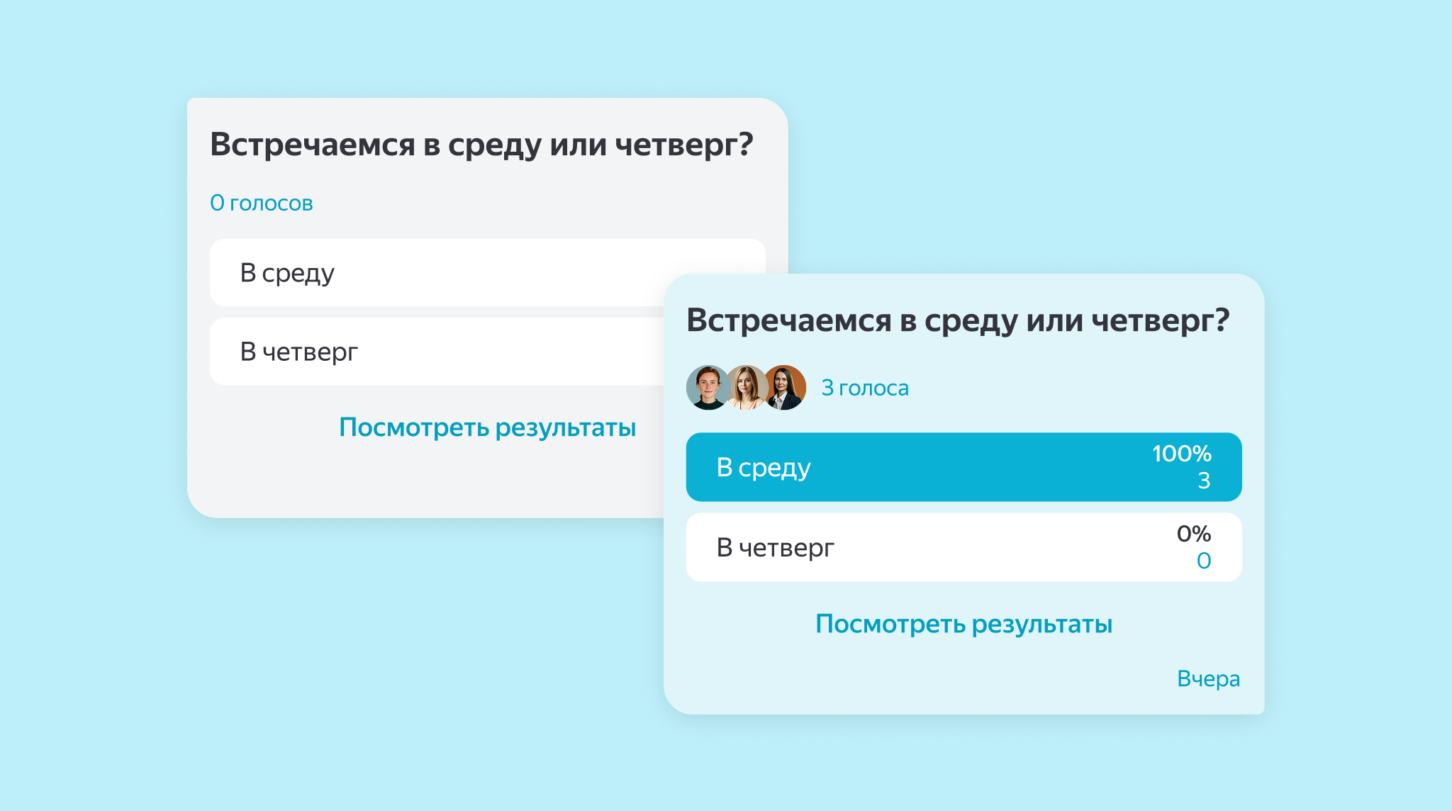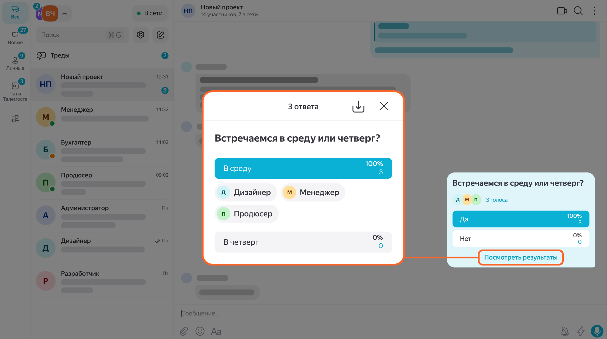 Как и кто проголосовал, можно посмотреть в Мессенджере или скачать результаты Excel-файлом. Если опрос был анонимным, результаты будут доступны только в Мессенджере — в обезличенном виде.