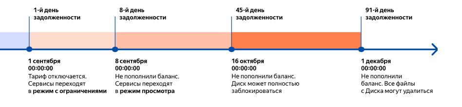 С 1-го дня доступное место на Диске сократится до 5 ГБ. Если из-за этого он переполнится, сервис сразу попадет в режим просмотра. На 45-й день Диск полностью заблокируется, а на 91-й день — отформатируется. После этого восстановить удаленные данные будет нельзя, даже если пополните баланс.