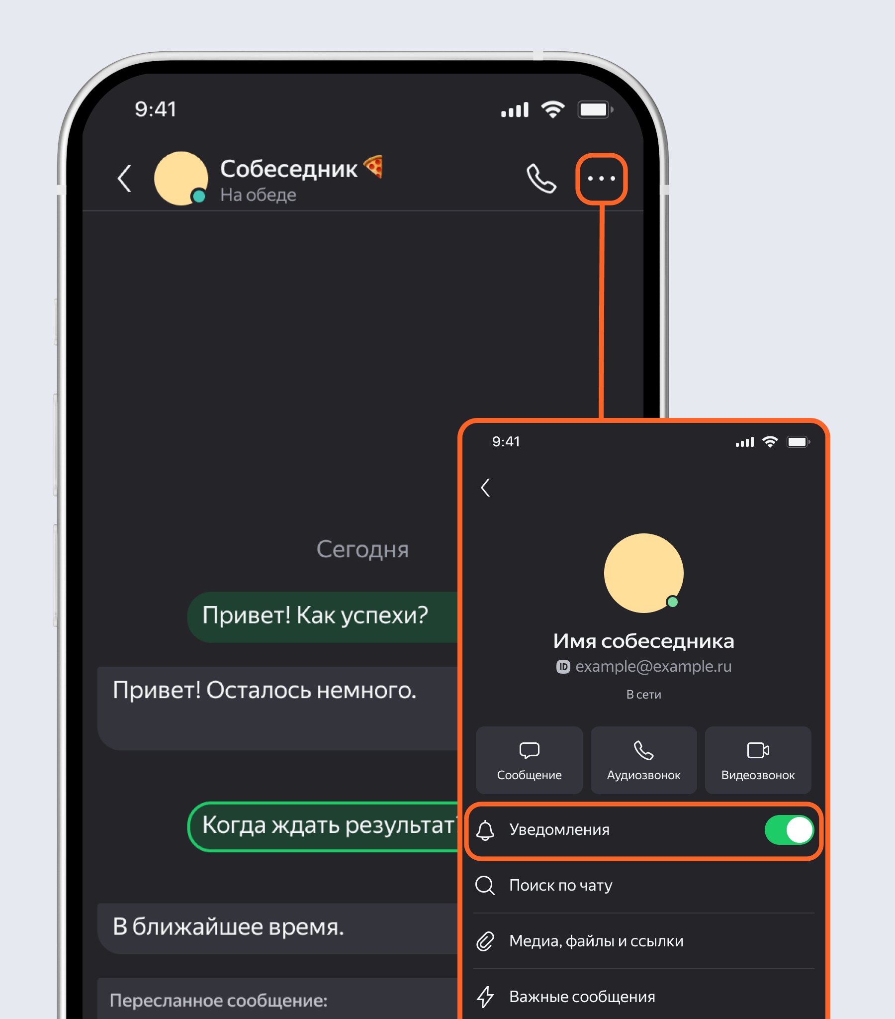 Чтобы уведомления из чата или канала не отвлекали, заглушите их. Для этого в чате нажмите