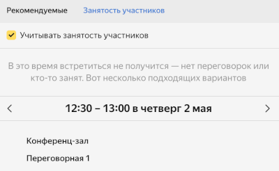 Чтобы Календарь предложил удобное для всех время и подобрал свободную переговорку, переключитесь на вкладку Рекомендуемые и включите опцию Учитывать занятость участников: