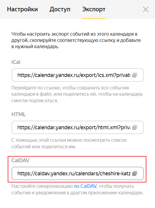 Перейдите на вкладку Экспорт и скопируйте адрес из поля CalDAV.