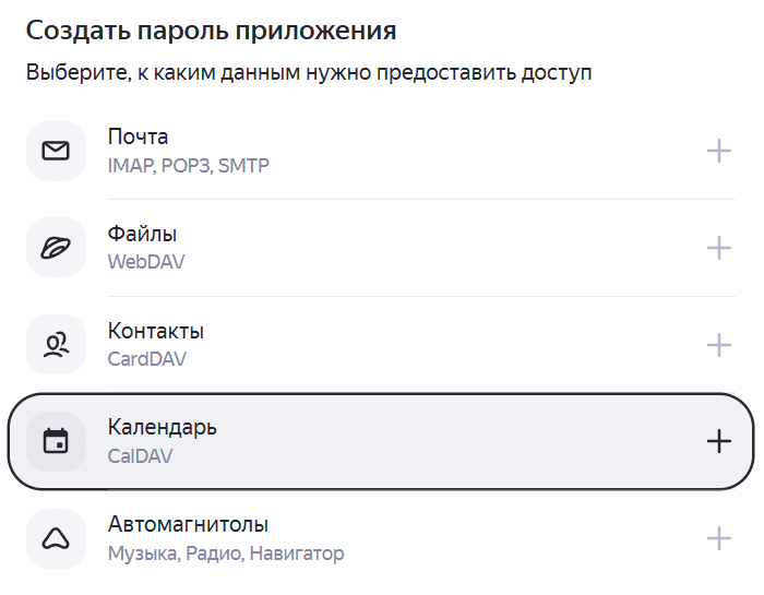 В разделе Создать пароль приложения выберите Календарь.
