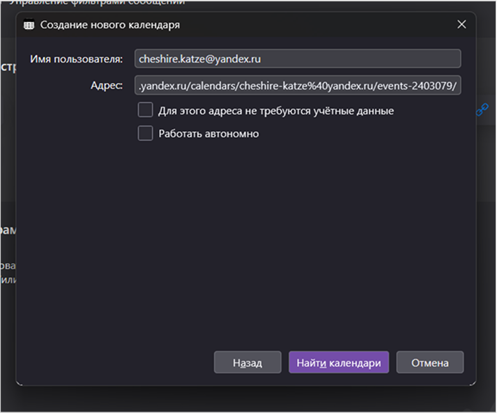 Отключите опцию Работать автономно. Нажмите Найти календари.