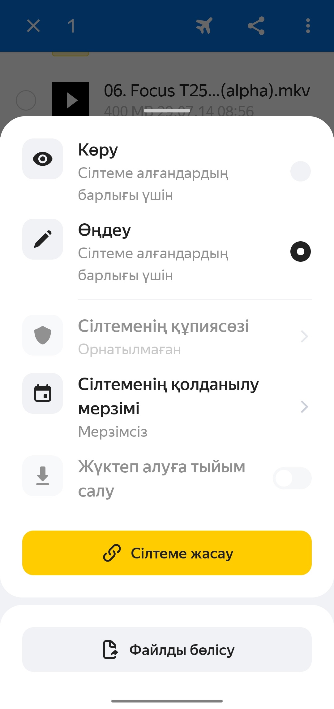 Мобильді қосымша арқылы қалтаға ортақ қолжетімділік баптау әзірге мүмкін емес. Сіз тек файлға немесе қалтаға сілтеме жібере аласыз.
