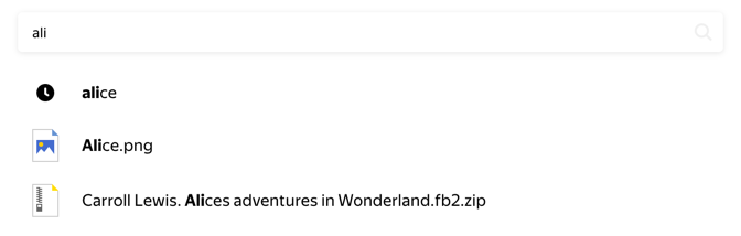 Егер файлдың атауы толық есіңізде болмаса, оны енгізе бастаңыз — Диск қолайлы нұсқаларды шығарады. Сондай-ақ Дискінің сыбырсөздерінде бұрынғы сұрауларыңыз көрсетіледі.