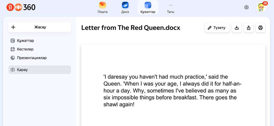 Мәтіндік құжаттар мен кестелерді айналдыру жолағы немесе ↑ және ↓ пернелері арқылы, ал презентацияларды экранның оң және сол жағындағы белгішелер немесе ← және → пернелері арқылы айналдырыңыз.