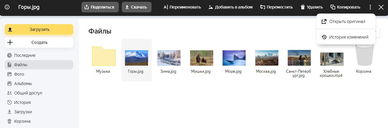 Основные действия с файлом или папкой отображаются на верхней панели или в контекстном меню. Чтобы увидеть дополнительные действия, нажмите значок . Все действия с файлами и папками сохраняются в Истории.