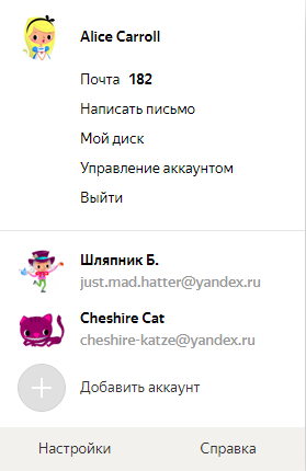 Вы можете выбирать аккаунт в Диске, Почте и других сервисах Яндекса, которые поддерживают эту возможность. Выбранный аккаунт считается основным: с ним вы будете авторизованы на сервисах, которые пока не поддерживают переключение.