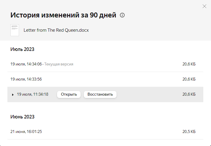 Если у вас подключен тариф Яндекс 360, вам доступна история изменений за последние 90 дней с момента создания файла. Если тариф не подключен, доступны версии только за 14 дней.