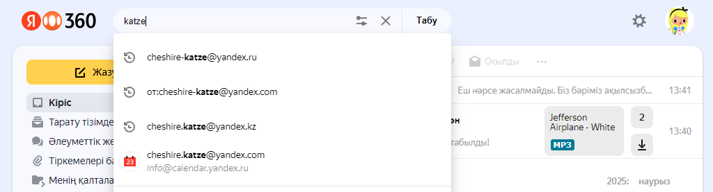 Сондай-ақ Яндекс Пошта сұрауда салынған файлдың атауын немесе салынған құжаттың мәтінін көрсетсеңіз, пошта хатты табады.