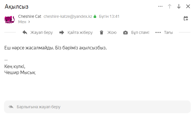 Сипатталған жағдайға кез келген пошта сервисі пайдаланушысы тап болуы мүмкін, өйткені барлық жіберуші пошта серверлері жіберушіні сәйкестендіру бойынша талаптарды сақтамайды. Егер сіз осындай хат алсаңыз, оны ерекшелеп, хатты спамды сүзгілеу ережесіне қосу үшін Бұл спам! батырмасын басыңыз.