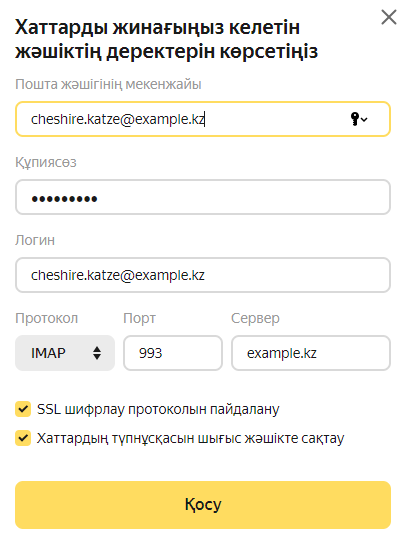 Басқа жәшікке кіру үшін қолданатын логин мен құпиясөзді көрсетіңіз. Кейін Қосу батырмасын басыңыз.