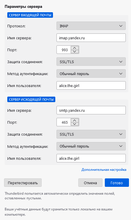 Нажмите кнопку Настроить вручную и укажите следующие параметры серверов электронной почты: