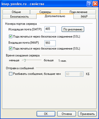 SSLдля IMAP- и SMTP-сервера.Нажмите кнопку OK.