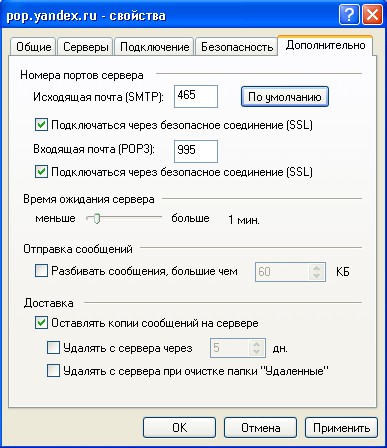 Для серверов POP3 и SMTP включите опцию Подключаться через безопасное соединение (SSL).