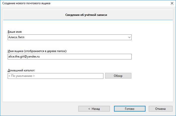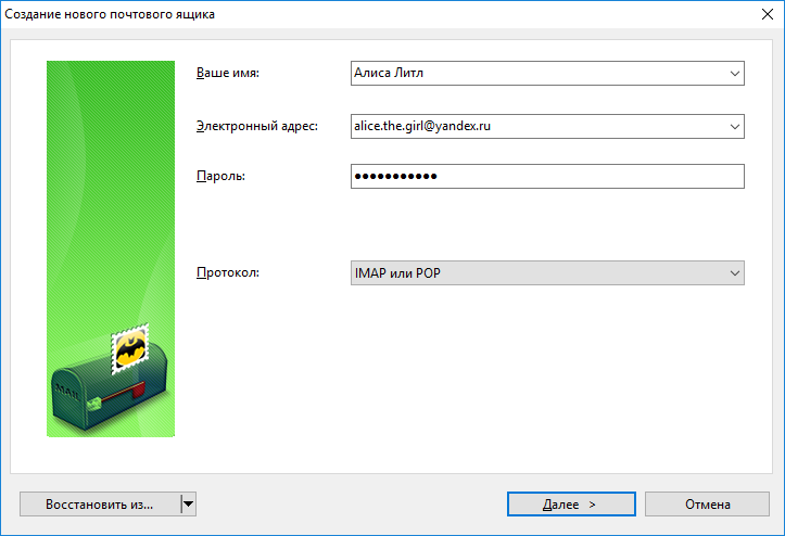 В окне Создание нового почтового ящика укажите следующие параметры учетной записи: