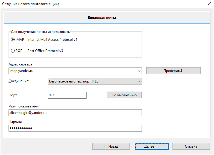 - Протокол — IMAP или POP.