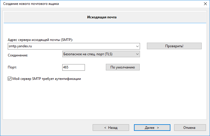 В окне Исходящая почта укажите следующие настройки учетной записи: