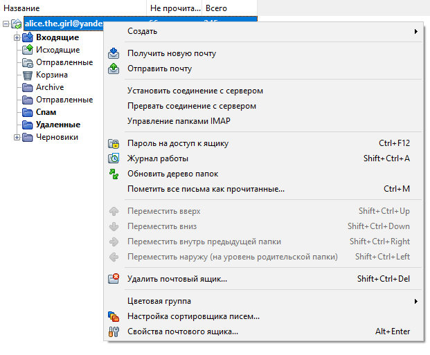 Синхронизируйте созданную учетную запись с сервером, чтобы получить список папок. Для этого нажмите правой кнопкой мыши на название ящика и выберите пункт Обновить дерево папок.