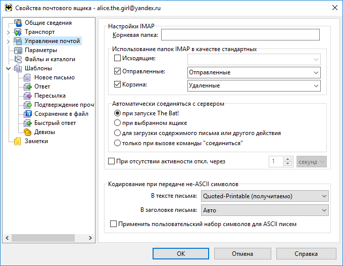 Нажмите правой кнопкой мыши на название ящика и выберите пункт Свойства почтового ящика. Слева перейдите в меню Управление почтой. В поле справа найдите блок Использование папок IMAP в качестве стандартных. Включите опцию Отправленные и выберите из списка значение Отправленные. В том же блоке включите опцию Корзина и выберите из списка значение Удаленные. Затем перейдите к блоку Автоматически соединяться с сервером и установите значение при запуске The Bat!.