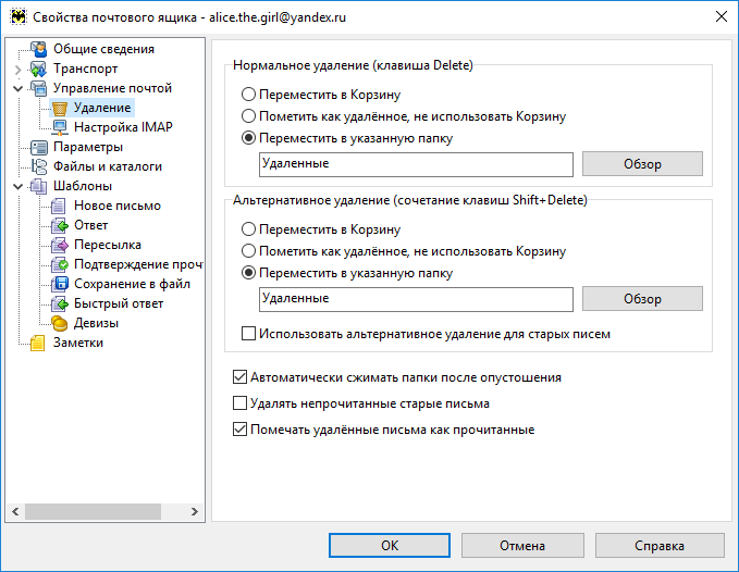 Нажмите пункт Управление почтой → Удаление и укажите в качестве папки для нормального и альтернативного удаления папку Удаленные. Также отключите опцию Использовать альтернативное удаление для старых писем и включите опцию Автоматически сжимать папки после опустошения.