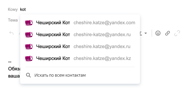 Для поиска по имени и фамилии можно использовать кириллические символы вместо латинских и наоборот. Например, для поиска контакта «Чеширский Кот» можно ввести как латинскую «k», так и кириллическую «к». Первыми в списке подсказок окажутся те адресаты, с которыми вы переписывались недавно.