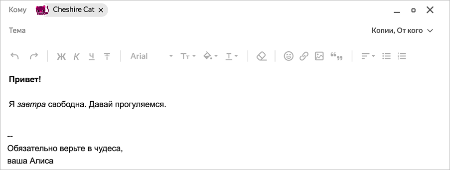 С помощью инструментов панели оформления вы можете выделить часть текста полужирным или курсивом, изменить цвет и размер шрифта, задать маркированный или нумерованный список, вставить картинку в письмо, добавить ссылку и т. д.