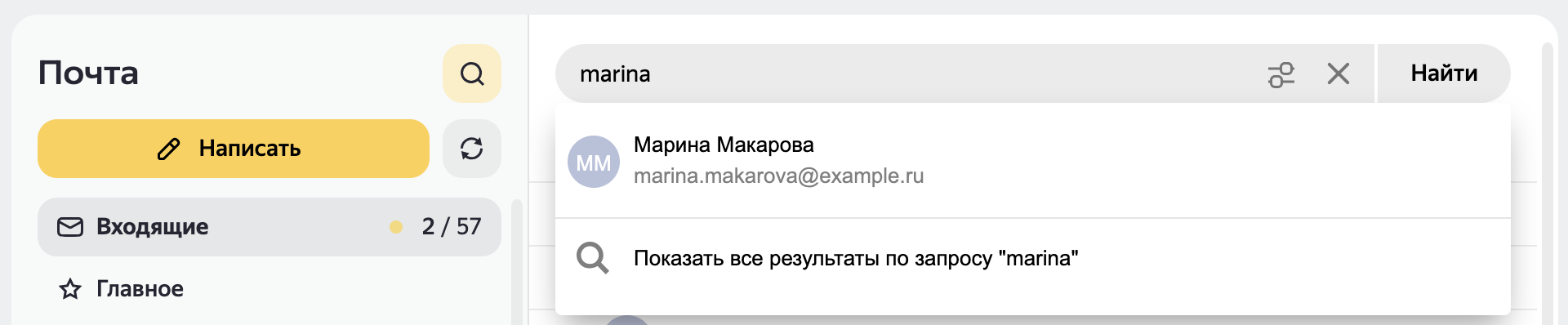 Если вы не помните имя контакта полностью, начните его вводить — Почта подскажет подходящие варианты. Также в подсказках Почты будут появляться ваши прошлые запросы.