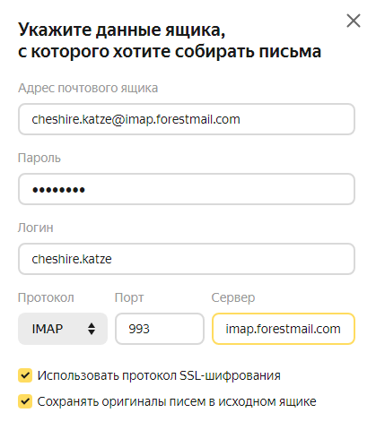 Если вы хотите собирать письма с почтового ящика на Яндексе в ящик другого сервиса, включите доступ к почтовому ящику с помощью почтовых клиентов С сервера imap.yandex.ru по протоколу IMAP (подробнее здесь).