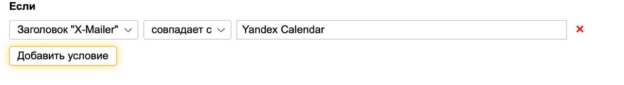В письмах от Яндекс Календаря поле Отправитель больше не содержит адрес info@calendar.yandex.kz. Сортировка, которая настроена по точному совпадению с этим адресом, не будет работать. Чтобы это исправить, в правиле обработки писем от Календаря удалите старое условие и задайте новое: Заголовок"X-Mailer"совпадает сYandex Calendar. В фильтр будут попадать письма о создании, изменении и удалении событий в Календаре от любых отправителей.