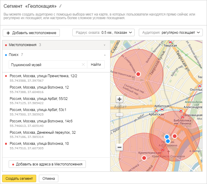 В сегмент можно добавить не более 1 000 местоположений (не более 100 для условия Аудитория: была N дней за период). Если ранее вы уже добавляли местоположения в этот сегмент, все они будут потеряны при добавлении списка.