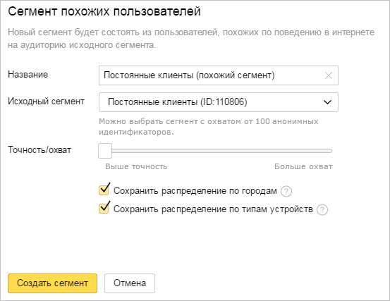 По умолчанию распределение пользователей по городам и типам устройств в новом сегменте будет приближенным к исходному. Например, если в исходном сегменте половина пользователей была из Москвы, а другая половина — из Санкт-Петербурга, в новом сегменте пользователи будут аналогично распределены по городам. Если не удастся найти пользователей, сохранив исходное распределение, Аудитории подберут наиболее похожих пользователей без учета городов проживания или типов устройств. Для поиска пользователей в любых городах или с любыми устройствами отключите соответствующие опции.