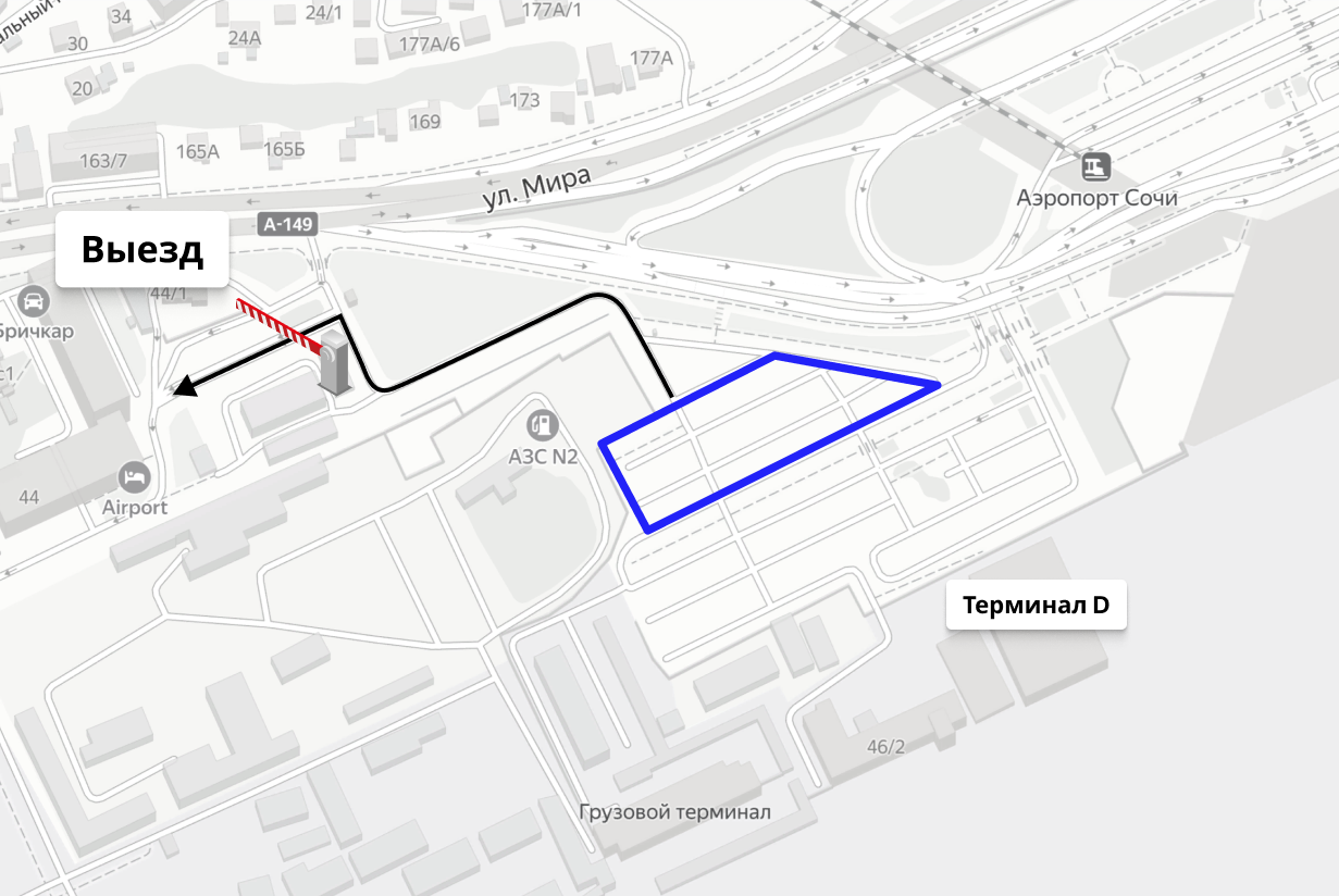 Двигайтесь вдоль парковки до указателя Выезд, затем — до шлагбаума. Он откроется автоматически.